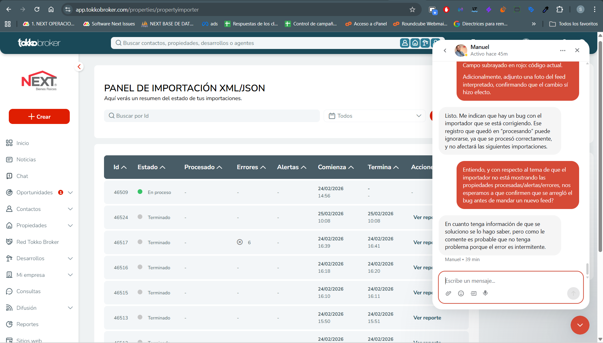 Intentamos revisar el importador de propiedades, pero no se muestran las propiedades procesadas ni alertas o errores. Posteriormente, nos comunicamos con el soporte técnico del CRM y nos indicaron que se encontraban trabajando en corregir ese bug, aunque las propiedades sí se habían procesado correctamente.